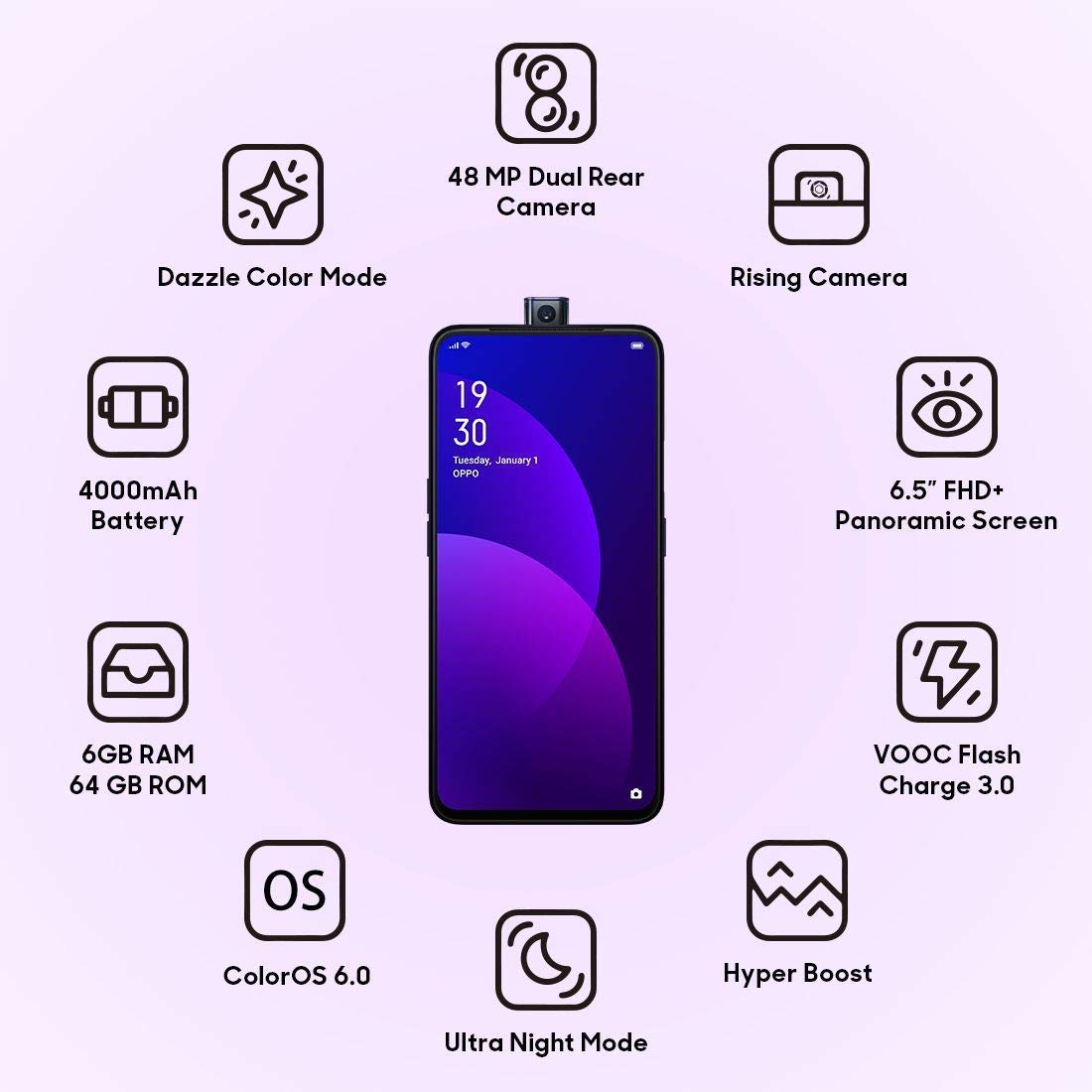 Handset, VOOC Charge Adapter, Earphone, USB Cable, Sim Tray Ejecter, Pre-applied Screen Protector and Protective Case, Booklet with Warranty Card and Quick Guide