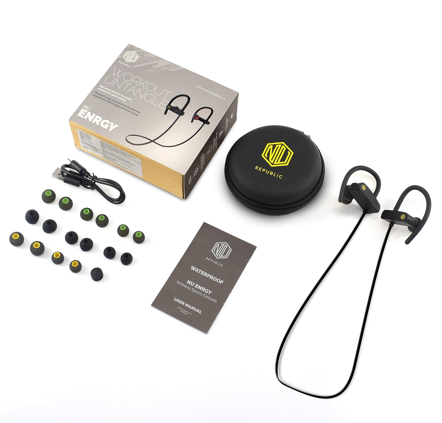 Ear Gels – 3 size set x 3 Color Sport carry case Quick Start Guide USB cable
